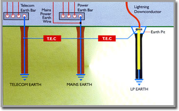 At some sites the use of separate earths for lightning, mains power and communications can work under normal conditions, however when large fault currents or transient voltages occur, potential differences between earths create a dangerous situation. In order to create a earthing system of the highest integrity, all separate earths must be bonded together to form an equipotential earth plane which will eliminate earth loops and potential differences arriving under transient conditions. |